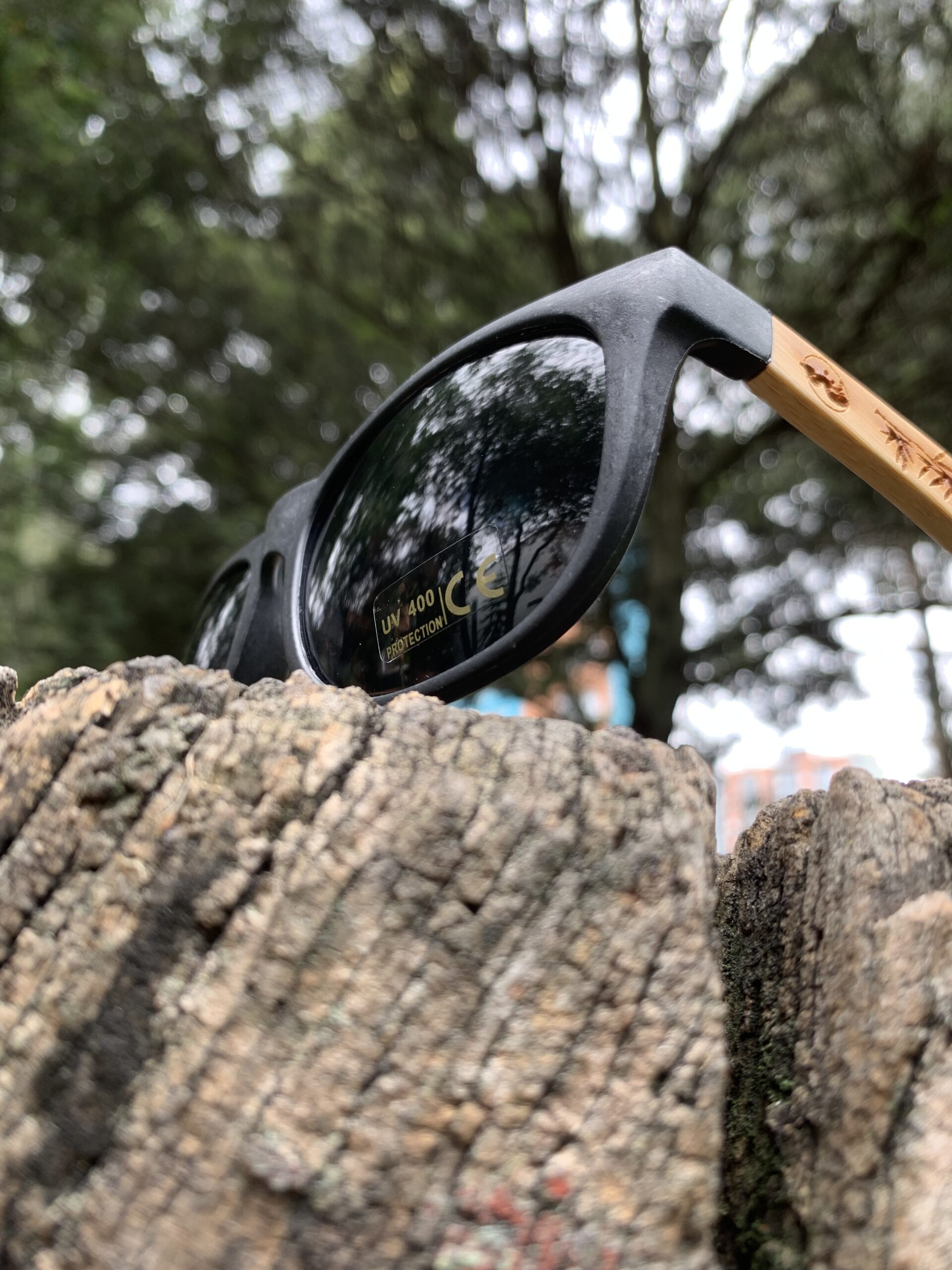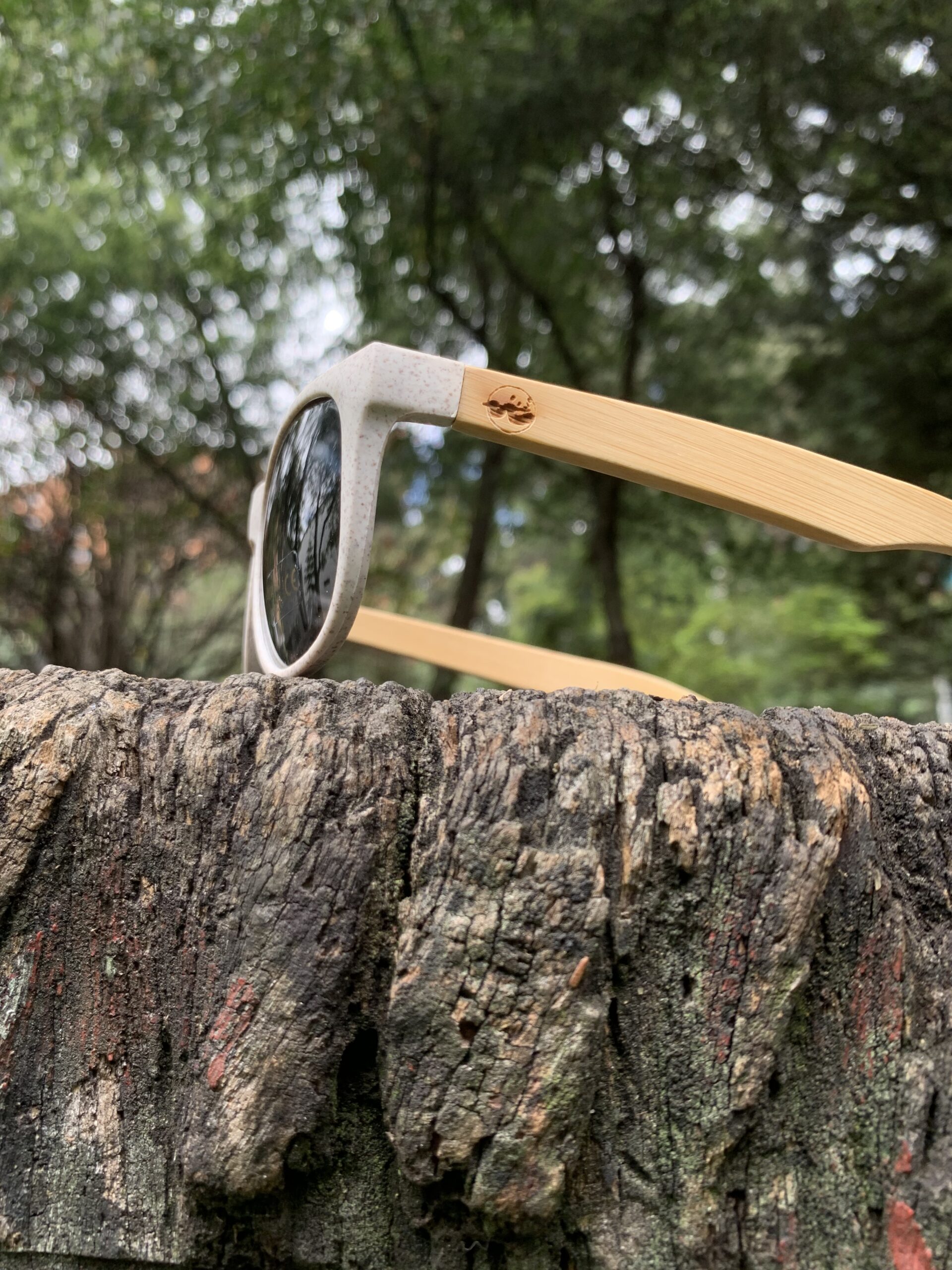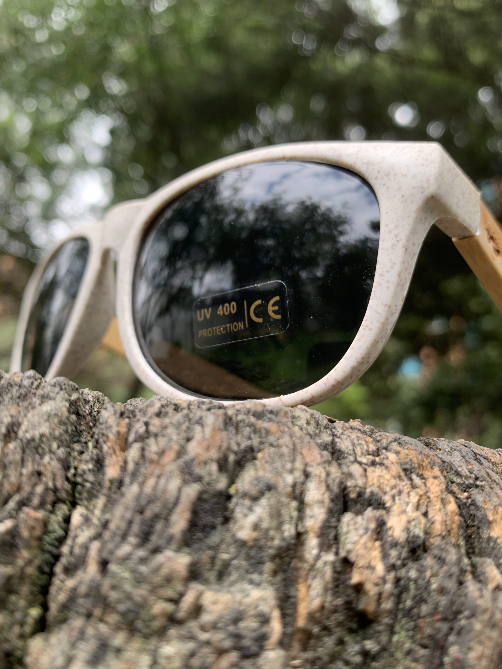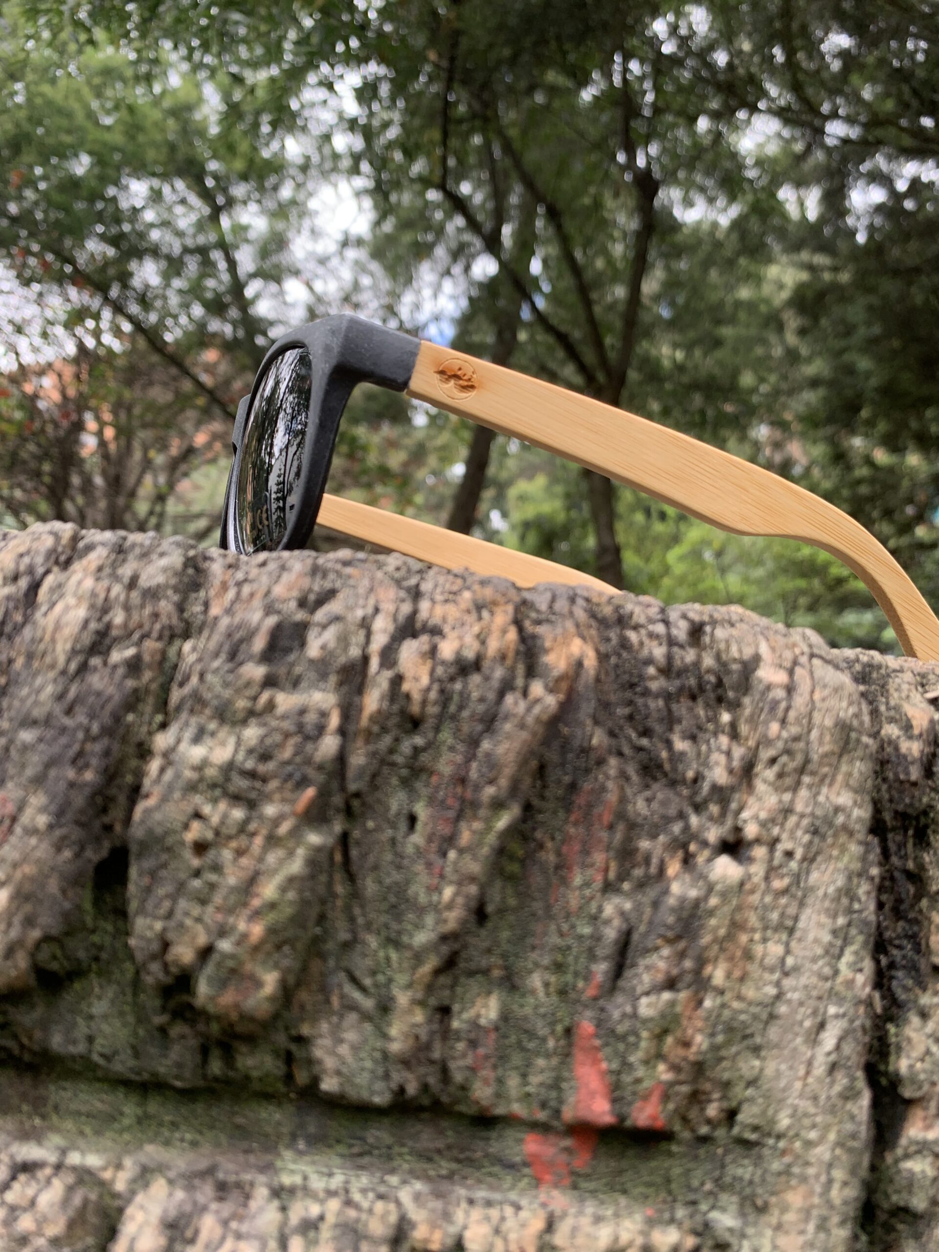 Gafas con filtro UV400 certificado. Patas fabricadas en bambú y marco a base de fibra de trigo. Livianas, resistentes e impermeables. Incluye funda y paño limpiador.