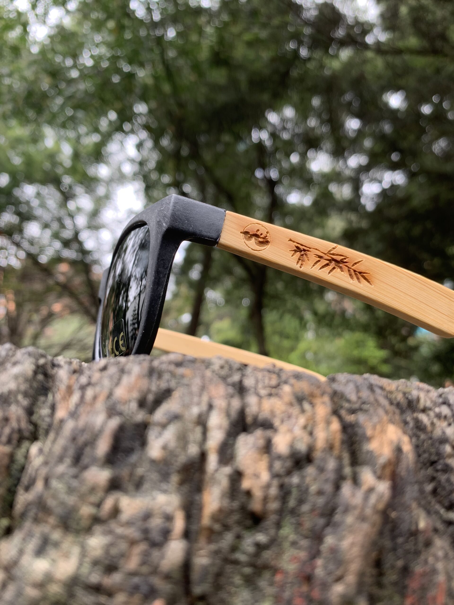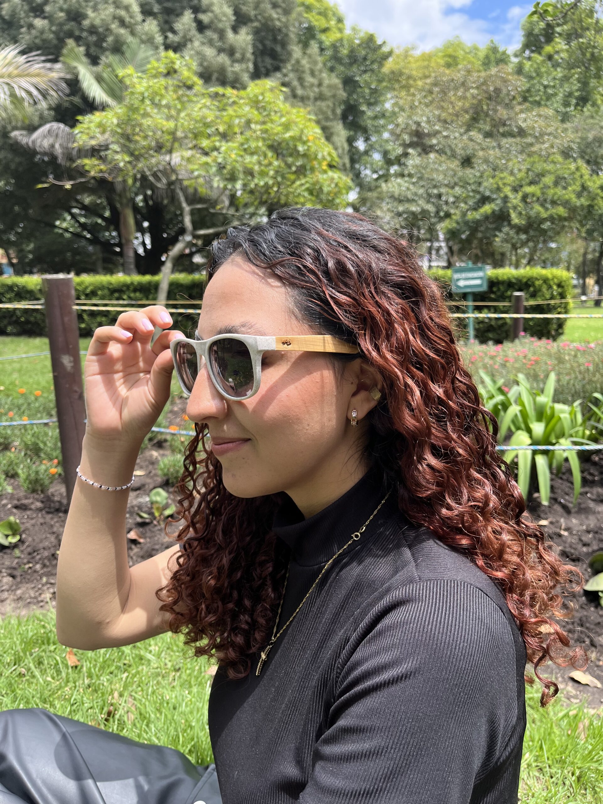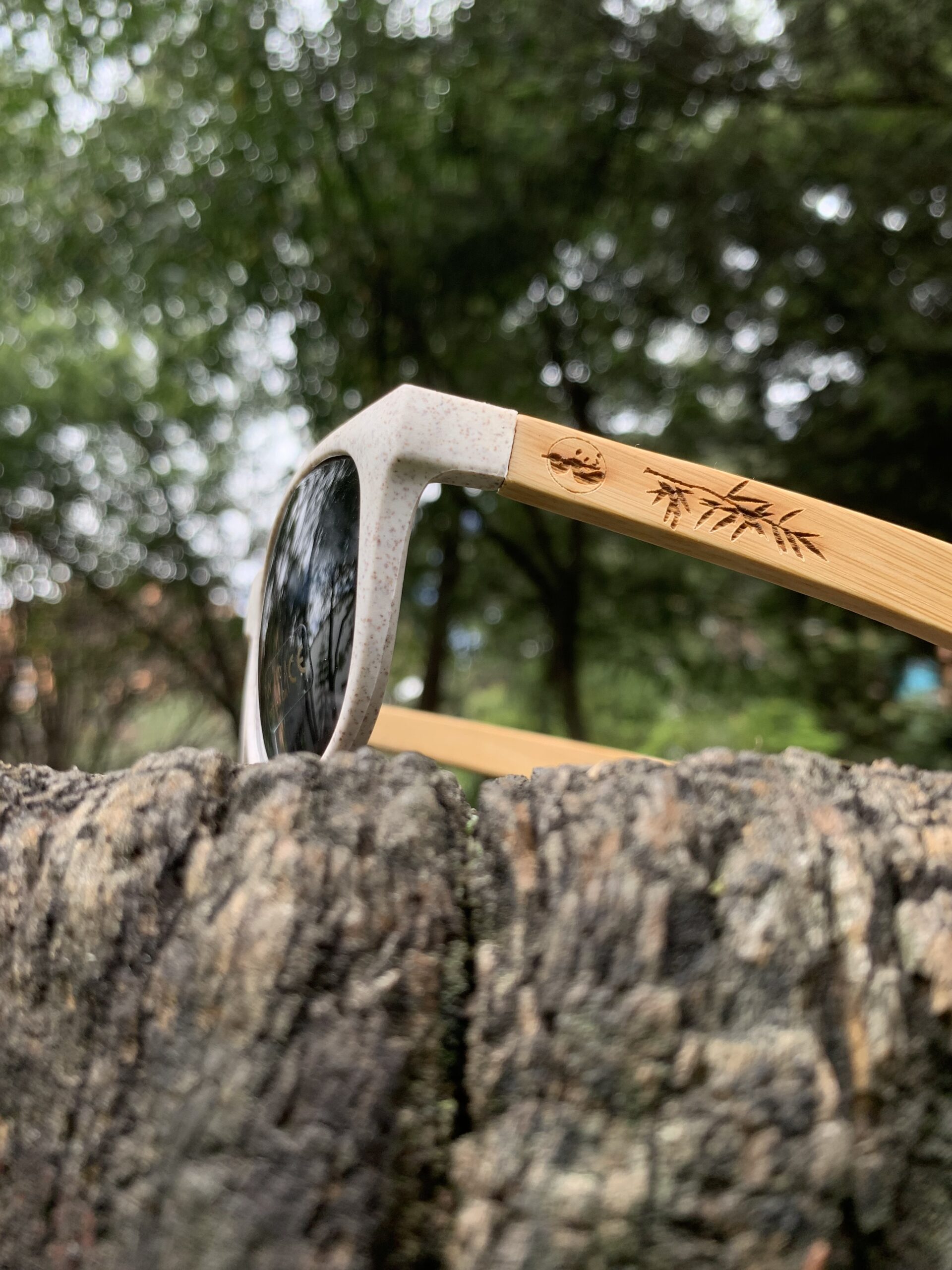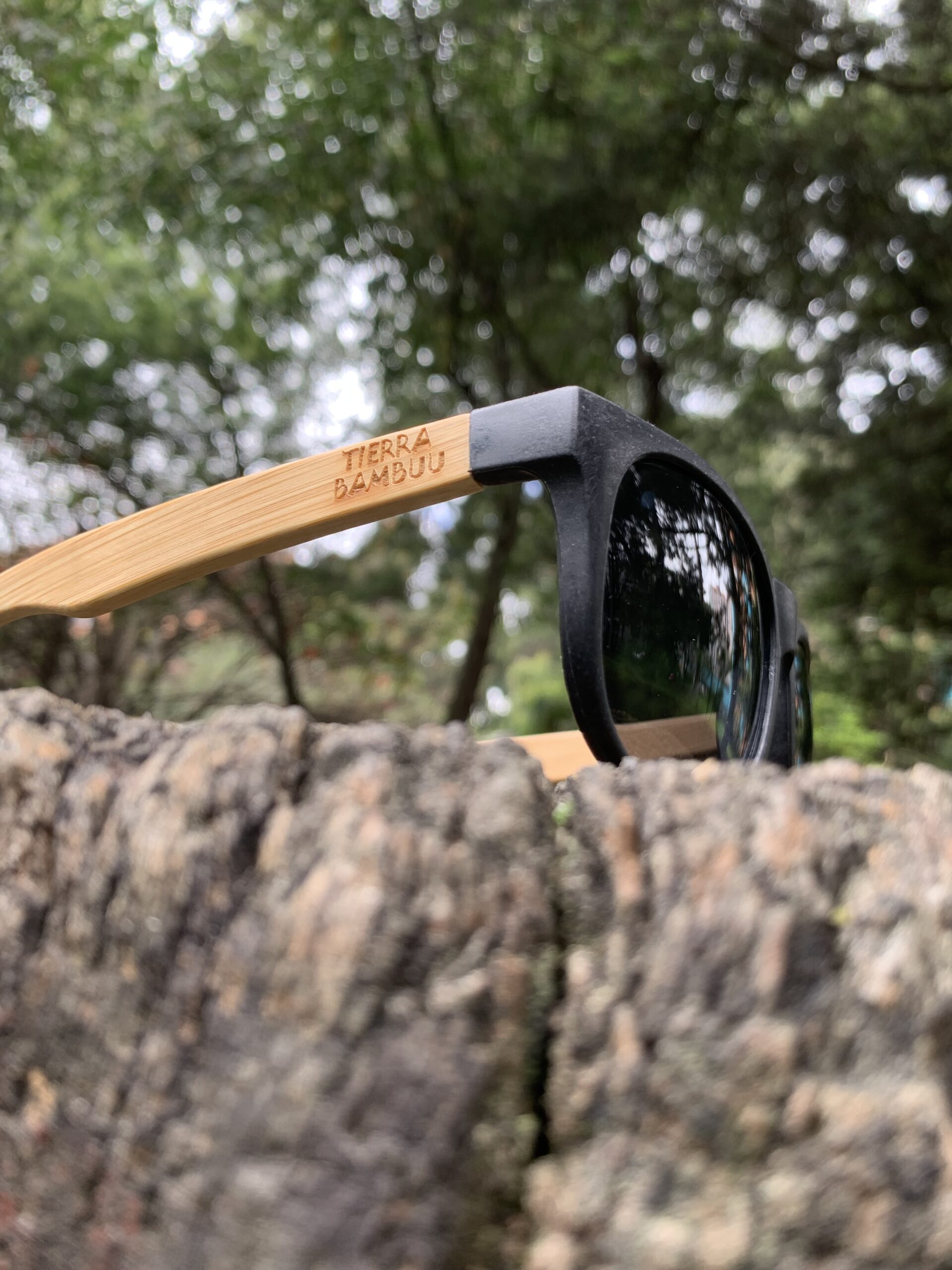 Gafas con filtro UV400 certificado. Patas fabricadas en bambú y marco a base de fibra de trigo. Livianas, resistentes e impermeables. Incluye funda y paño limpiador.